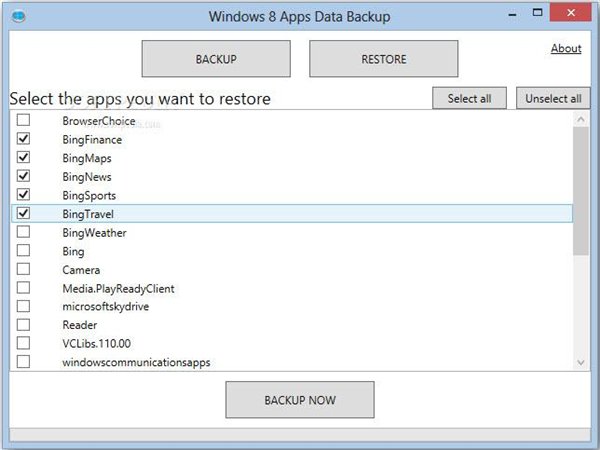 Windows 8的应用程序数据备份 是一个免费的,简单易用,让您备份所有数据到Windows 8内部,你需要重新安装Windows 8商店的应用程序。