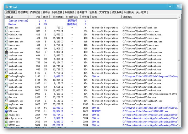 1.目前 Wtool 通过系统底层方式枚举进程,可以轻易的将系统中所有进程(包括隐藏的进程)显示出来;