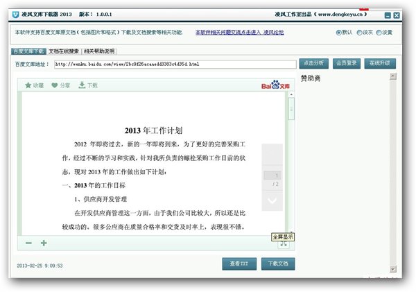 1、输入百度文库的地址,然后点击“点击分析”按钮即可以Flash方式来预览文档,预览的时候是可以全屏预览的,也可以点击“查看txt”按钮,这样你就可以直接复制里面的文字了。