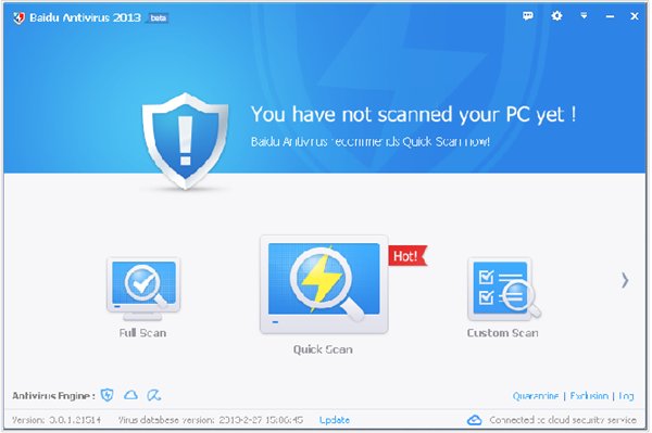 百度杀毒软件 Baidu Antivirus 2013是从此前的Baidu PC Faster Antivirus分离出来的。这款软件目前拥有三大引擎:百度本地杀毒引擎、云杀毒引擎和小红伞(Avira)杀毒引擎。百度杀毒软件默认使用百度病毒引擎和云病毒引擎进行实时监控,使用百度病毒引擎、云病毒引擎和小红伞病毒引擎进行扫描。