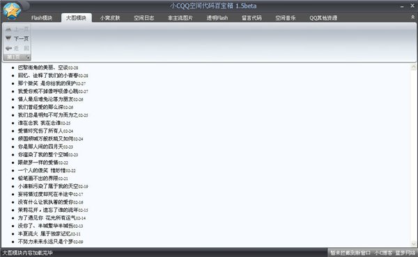 QQ空间代码百宝箱是qq空间代码大全免费版软件,主要用来获取QQ空间中的部分代码、图片、Flash素材,并不能代替QQ空间黄钻贵族等特权;