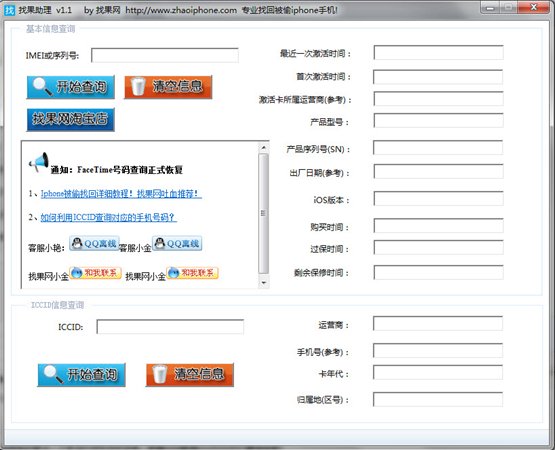 找果助理 1.1 绿色版 找果助理,一款专门为iphone失主打造的软件,快速查询手机的最新激活时间和iccid的归属地信息,第一时间掌握手机动态,及时查询,及时定位!iphone找回成功率再提一层!