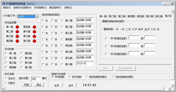 功能性说明:PC智能家电控制盒,可以同时控制8路电器设备的开关状态,控制方式可以分为:手动控制、彩灯控制、定时控制三种。