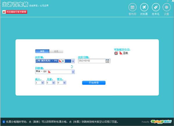 出游百宝箱目前可以查询亚洲航空、宿务太平洋航空、捷星航空与及老虎航空四家航空公司的实时机票价格。出游百宝箱的定位并不是“抢票器”,虽然它对自由行驴友们在飞东南亚的四家大的廉价航空公司举办机票大促销时抢先一步订到心宜的机票很有帮助。