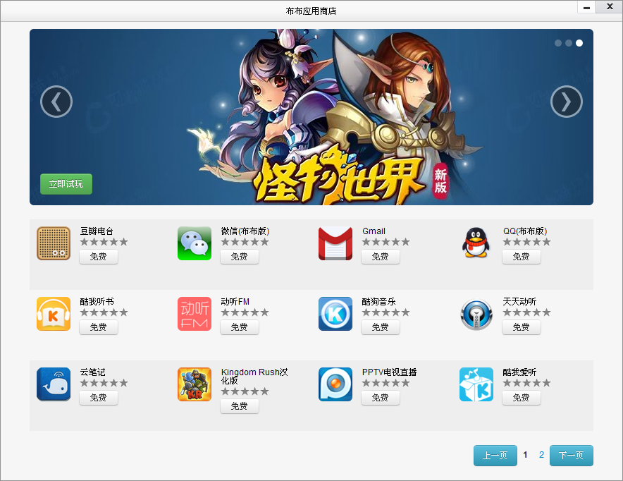 布布应用商店是一款电脑上的Appstore,我们致力于将手机应用平移至电脑,目前收录了奇艺、豆瓣电台、斗地主、网易公开课等多款精彩应用。