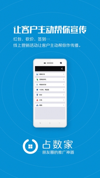 你用“占数家”一键创建个“活动宣传页”,通过微信给客户,让客户转到朋友圈里,动员朋友点,每点一次就是给你宣传了一次。点到你满意,就给他折扣!