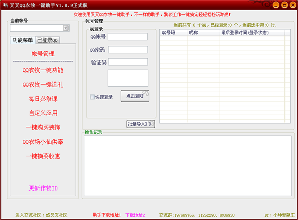 叉叉QQ农牧一键助手是一款QQ空间农牧场的辅助工具,具备QQ农牧一键送礼、购买装饰、摘菜收崽等功能,使用该软件,可以轻松一键搞定繁琐的工作。