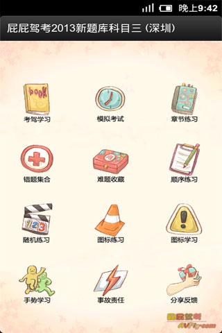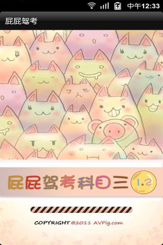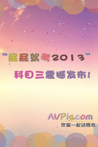 屁屁驾考2013科目三是你获取驾照的首选,(目前共有北京,上海,重庆,广东,广州,深圳,四川,成都,浙江,杭州,江苏,南京,河北,山东,陕西,天津,武汉,山西,黑龙江,安徽,宁夏等区域),题库采用2013年最新版,适用于小型汽车(C1)、小型自动挡汽车(C2)。用户选择其所在的考试区域后,本款软件完全按照车管所考试规则,随机生成所在区域的考试题目,让用户百分百接近真实考试环境,AVPig只为您打造,通过考试不是梦,交钱补考是浮云!
