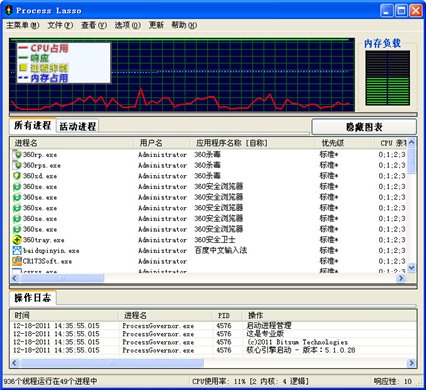 Process Lasso 是款智能系统优化工具,主要功能是动态调整各个进程的优先级并设为合理的优先级类以实现为系统减负的目的,此项特性被 Process Lasso 定义为过载抑制(out-of-control restraint),可有效避免蓝屏、假死、进程停止响应、进程占用 CPU 时间过多等症状。同时它还具备前台进程推进、工作集修整、进程黑名单等附加特性。Process Lasso 对您系统的优化是完全实时+智能的,不会修改任何系统既有配置。且其支持命令行操作和服务器《=》客户端的远程管理,而内核又可脱离用户界面单独运行,因此普遍适用于普通家庭用户和专业工作环境。