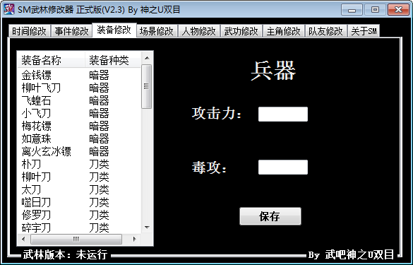 首先单击未明进入人物属性面板,切出游戏打开SM武林修改器——场景修改,即可读取到当前位置,选择要瞬移到的位置,单击修改,提示修改成功后请于设定时间内(默认10S)回到游戏,存档,再读档即可。由于场景坐标问题,可能会出现如主角在房梁上无法移动或就不再屏幕内的情况(经过优化,出现概率≈0)。此时则需要修改坐标X、Y,数值范围为0-255。
