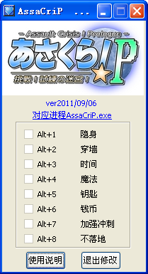 AssaCriP修改器下载+8 绿色版 AssaCriP修改器由笨小猪制作,共有八项属性修改能力,赶紧下载使用吧。