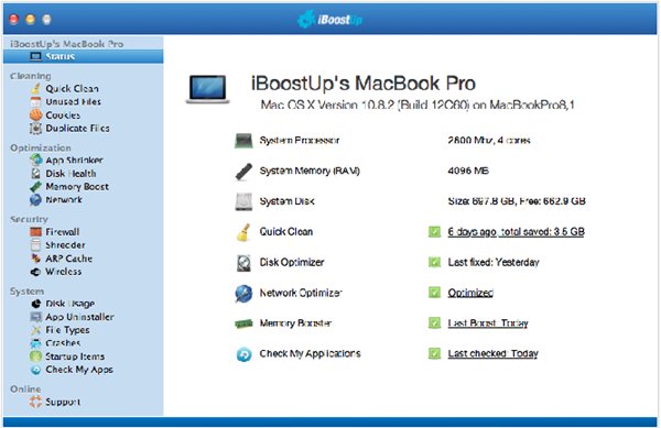 iBoostUp 就是这样的优化软件中较为优秀的一款。它能够清除 cookies、压缩应用体积(删除用不着的多语言文件等)、清除系统缓存、优化磁盘、安全粉碎文件以及进行其他优化工作,这些都是免费功能。另外还有付费功能,例如找出重复文件、内存优化等。
