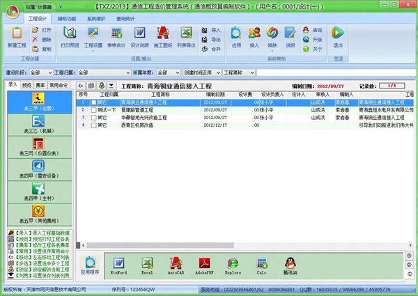 通信工程造价管理系统(TXZJ2013)是网天公司以工信部规[2008]75号通知发布的《通信建设工程概算、预算编制办法》及相关定额为依据,并结合当前通信设计行业发展现状而研制开发的。系统由概预算编制、竣工资料编制两部分组成,实现了通信工程设计、施工、竣工验收及固定资产交付等各阶段造价管理的资源共享和自动化处理。该系统具有广泛适用、造价完整、功能齐全、操作方便、计费灵活、性价比高等特点。广泛适用于通信线路工程、通信设备安装工程、通信管道工程等的新建、扩建、改建工程的概算、预算、结算以及决算的编制工作。适用于所有从事通信工程设计的单位及个人使用,是行业内不可多得的智能化应用软件。