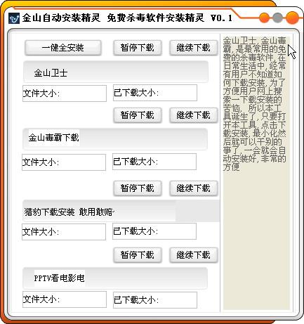 金山自动安装精灵提供金山卫士、金山毒霸、猎豹浏览器等产品一键全安装是一款关于金山产品的一键自动安装器,可以自动下载和安装,非常的方便,软件运行之后,即会最小化,不妨碍你干些别的事情。