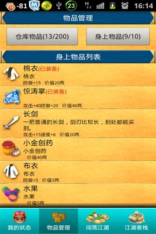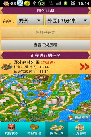 "菜鸟闯江湖"是一款武侠类RPG,当我们按下"闯荡江湖"界面「开始任务」,我们的菜鸟主角就自动开始闯荡江湖了,没错,放置型RPG就是这样,只要你装备好我们的主角、选择要去闯荡的任务、身上带上物品就可以了,一旦任务开始后,我们就无法控制主角了,电脑会以随机的方式,決定主角在闯荡中是否遭遇到敌人、宝箱、池塘等特殊事件......因此我们只需要把手机[放置]在一边,然後定期查看一下任务进展情况就可以了,不必要时时刻刻都盯着手机,任务成功或者失败都会在状态栏弹出提示,这就是放置型RPG,你懂了吗?