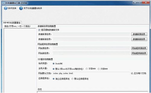 IIS批量建站工具 1.0 绿色免费版 IIS批量建站工具采用.net framework 4.0作为框架,大幅度提高了软件的性能,iis批量建站工具给用户带来了全新的体验,让建立站群的企业、公司从以前繁琐费时的一个一个建站中解脱出来,只需10秒的简单配置便可以轻松实现批量建站。
