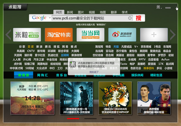 米粒搜桌面是一款清新风格的上网导航软件。在使用电脑上网浏览、工作学习时,随时都可以调出软件,进行网络搜索和网址导航。软件定为于年轻时尚人群,喜欢尝试和改变,在使用电脑的过程中,随时都可以调出“米粒搜”界面,进行网络搜索和网址导航,帮助用户进入更加丰富多彩的网络世界。