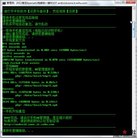 4.等待手机还原完成后,依照ROOT软件的提示,继续按任意键下一步,手机开始重启