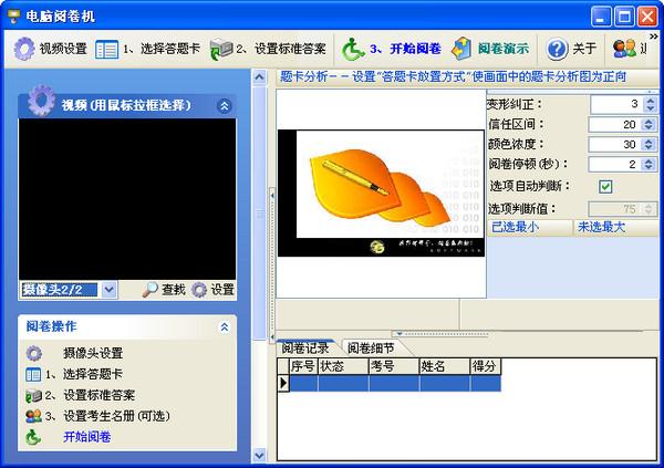 电脑阅卷机 V1.1下载 电脑阅卷机是一款电脑阅卷的软件,根据教师工作习惯,使用极其方便,可阅读判断题、单选题、多选题等多种题型,通过普通手机阅卷(山寨机、智能机均可),无需购买摄像头,无需专用支架,使用方便,且能够快速准确地阅卷评分,并能输出详尽的成绩和统计报告。操作简单,使用方便,准确高效,极大地提高了工作效率降低了劳动强度。