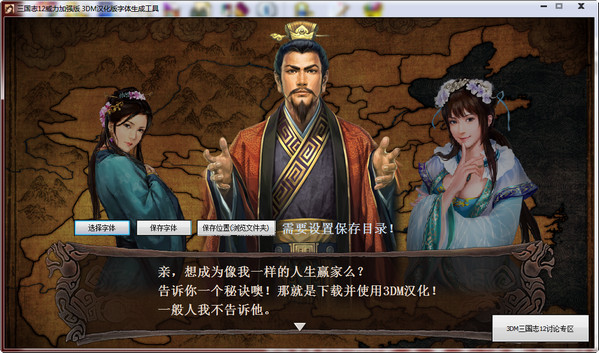 使用说明:本工具可用于自定义由3DM汉化的三国志12及威力加强版的字体。