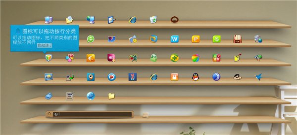 可以直接打开文件,不需要双击鼠标。把文件直接拖到windows桌面,或保存到windows 桌面,或在windows桌面建立快捷方式,板栗桌面都会立刻显示。板栗桌面上的图标和windows桌面是自动同步的。 在板栗桌面木架上无图标处鼠标右键,右键菜单中选:新建图标收集器,木架上就会创建一个小木盒。你可以把一些功能相似的图标拖进去。