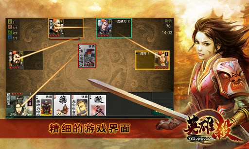 ★《英雄杀》是由PC版英雄杀原班团队精细打造而成。Android版的英雄杀与PC版英雄杀一样提供了主公,忠臣,内奸,反贼四种角色,包含了古代各色英雄。既有如秦始皇、李世民,曹操这样的千古帝王,又有时迁、李逵这样的民间英雄,还有西施,陈圆圆,李师师等等绝色佳人,可谓英雄美人齐聚!整个“杀人”游戏过程充满着智慧与人性的对决,紧张有趣,需要冷静的判断和智慧才能获取胜利。★Android英雄杀结合移动应用和Android设备的特点,在操作和交互体验上做出了专门的优化,使得操控更为快捷方便,本次版本特别设计出支持【滑动杀】的操作,支持滑动出“杀”,也就是能滑动人物头像进行出“杀”,使得玩家的“杀人”体验更加爽快!