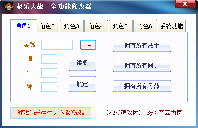 极乐大战全功能修改器 1.0 绿色版 极乐大战是一款以传统大富翁为程序架构、以传统神话故事西游记为背景的益智类游戏,为了增添游戏的乐趣,提供一款极乐大战全功能修改器给大家使用。