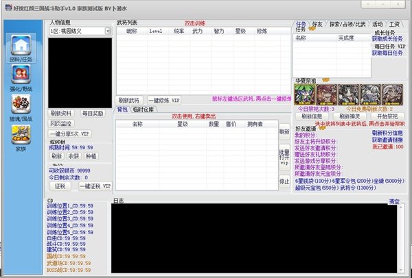 红眼三国是腾讯应用平台的一款穿越类策略游戏,目前游戏已公测,好搜红颜三国战斗助手则是该款游戏的应用辅助软件,支持一键擂台PK、一键国战、一键赠送礼物/接受回赠礼物、家族功能、智能猎魂等功能,本软件为每晚21点到23点为免费时段,欢迎下载使用。