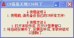 cf磊磊无视230补丁 yx-8 绿色版 使用cf相关辅助时,如果出现了230代码,可以使用cf磊磊无视230补丁,完全解决该问题。