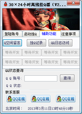 静水流深30×24小时离线挂Q器是一款功能强大的离线挂Q工具,最新版本新增了辅助功能窗口界面,具备Q空间留言、挂Q记录、QQ日志访问、QQ状态查询等功能,欢迎下载使用。