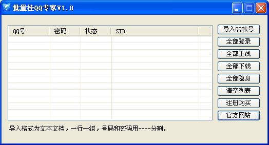 速成软件开发的批量挂QQ专家软件,可以批量登录qq、批量上线、批量隐身、资源占用低、挂机必备!