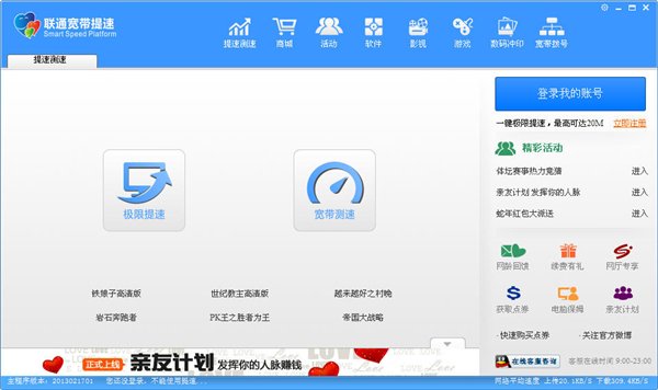 宽带提速是联通联通自助宽带客户端2.0版本的重要新增功能,它是一项针对重庆联通宽带用户提升网络带宽的业务。该业务可对在联通自助宽带客户端上已绑定的VIP用户进行实时的带宽提升,以满足用户随时或者特定时间段需要增加带宽、提高网速的需求。即时根据用户的需求随时提升网速,省去重新办理更大带宽的麻烦。