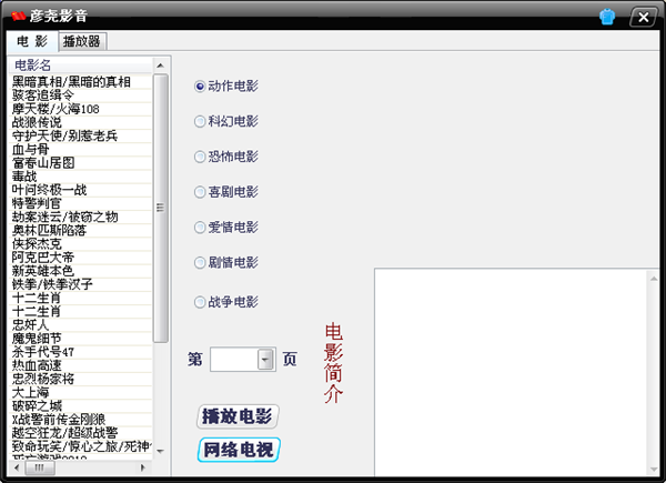 彦尧影音是一款在线电影播放器软件,提供动作电影、科幻电影、恐怖电影、喜剧电影、爱情电影、剧情电影和战争电影收看。