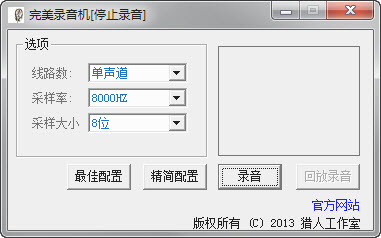 完美录音机一款的方便快捷的录音软件免费下载绿色版。用户可以选择最佳配置,以及精简配置这两种配置来录音,当然用户也可以选择自己喜欢的配置,不管是什么配置录的音,录音效果都是非常不错的。