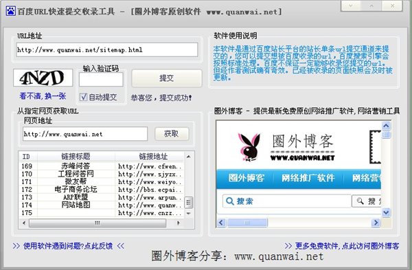百度URL快速提交收录工具 免费版 百度URL快速提交收录工具是通过百度站长平台的站长单条url提交通道来提交的,由圈外博客站长卷卷原创开发;您可以使用本工具提交想被百度收录的url,百度搜索引擎会按照标准处理。百度不保证一定能够收录您提交的url。但经卷卷测试确有奇效。已经被收录的页面快照会及时被更新。