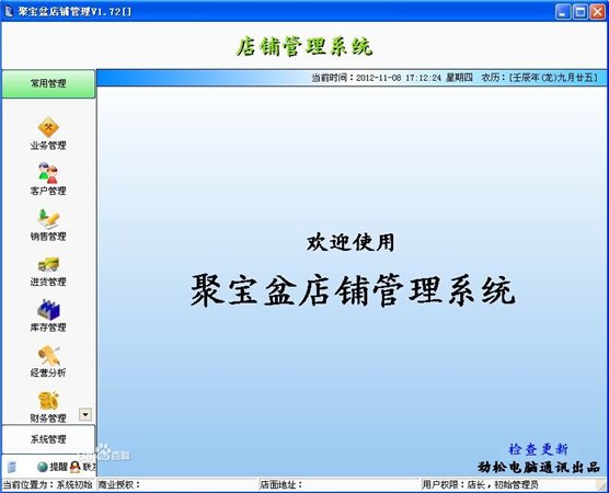聚宝盆店铺管理,虽不是系出名门,也没有漂亮的界面。但它有超强的速度,很小的CPU和内存占用率(经常在CPU为700M、256内存的机器上测试。速度和极小的资源占用才是作者的追求)。强大的统计功能,省心的操作方式。是您开店创业的第一帮手。