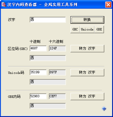 软件开发者经常会遇到一些汉字代码转换的问题,常见的汉字内码表现形式一般包括区位码、Unicode码、GBK码等几种。 汉字内码查看器是一款汉字、区位码、Unicode码、GBK码互转的小工具,希望对大家有用。