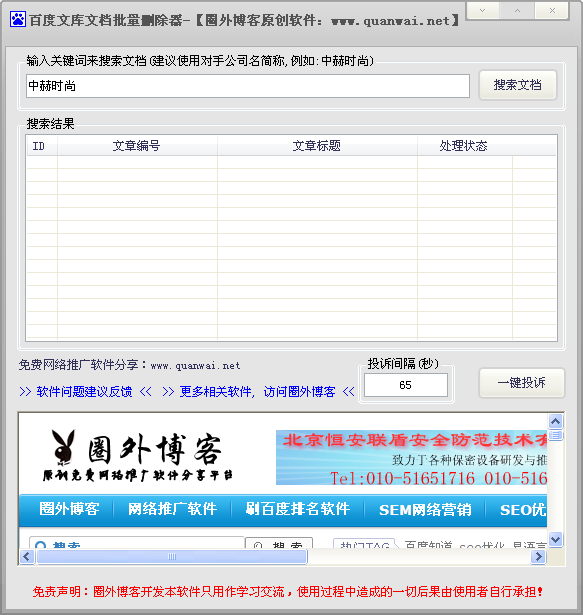 圈外博客制作的百度文库文档批量删除器是一款一键批量投诉竞争对手百度文库文档的神器,欢迎下载体验。