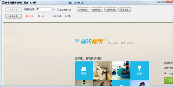 夜幕兔微博自动广播器支持腾讯和新浪微博,可以实现自动化发送微博,支持多条微博批量发送,支持最小化,欢迎下载使用。