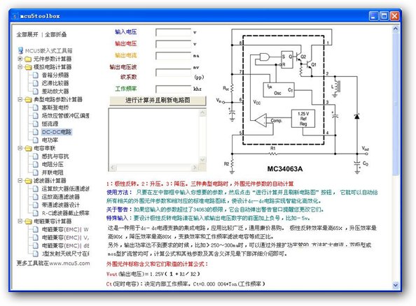嵌入式工具箱(mcu5toolbox)是一款完全免费的专业级的嵌入式工具箱,是mcu5.com其中一部分功能的脱机版,它能够让您得方便的使用电子电路设计中常用的辅助工具。在硬件设计中,有如下小工具。元件参数计算器,模拟电路计算器:音箱分频器计算器-迟滞比较器计算器-差动放大器;典型电路参数计算器:惠斯登电桥计算器- 场效应管缓冲区偏差计算器-恒流源计算器-dc计算器-dc电路计算器-电功率计算器-电容串联计算器-感抗与容抗计算器-电阻分压计算器-并联电阻;滤波器计算器:运算放大器低通滤波器计算器-运放高通滤波器计算器-带通滤波器设计计算器-r-c滤波器截止频率;电磁兼容计算器:电磁兼容(emc)| w, dbw 和 dbm转换计算器-电磁兼容(emc)| v, dbv 和 dbuv转换计算器-电磁兼容(emc)| dbuv 和 dbm转换计算器-j型发射天线尺寸在线计算器