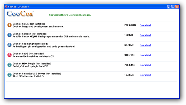 CoCenter是专门为CooCox系列软件下载、安装、升级和卸载而设计的一个软件管理平台,支持多任务运行和断点续传。用户使用CoCenter升级CooCox软件只需下载补丁包,不需再下载庞大的安装包。