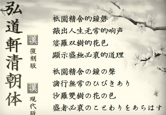 弘道轩清朝体是1875年神崎正宜创立的弘道轩所发表的楷书活字字体。在1881年被《东京日日新闻》选定为正文用字。字体端庄遒劲,既存有江户时代的遗风,又开启了明治时代的崭新气象。弘道轩清朝体在一百三十余年后的今天实现了数字化,并分为遵照原字模制作的复刻版,以及根据日本新字体规范修改的现代版两个版本。自此之后,它必将历久弥新,在汉字史上书下浓墨重彩的一笔。