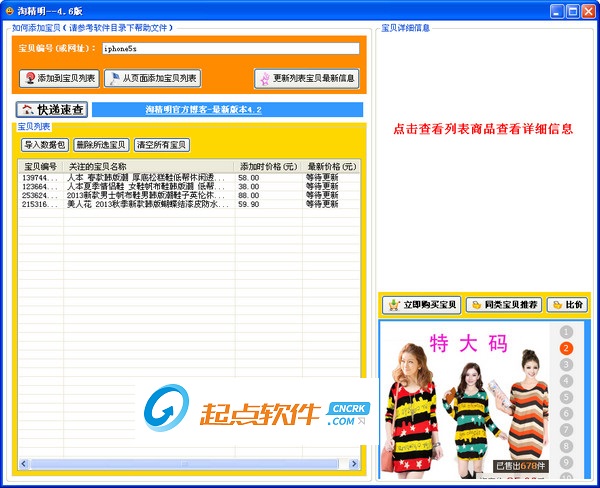 只要你所关心的宝贝降价或进行促销,软件会在第一时间显示并采用红色标记出来,可以直接点击软件中的购买按钮去淘宝购买。支持所有快递公司的快速查询。支持淘宝商品比价功能,支持淘宝同类商品比较查询。淘宝购物必备工具软件。用户反馈:能搜藏保存我喜欢的东西,还不用登陆淘宝账号,而且里面有一键查询所有宝贝最低价格,连商家促销,打折等等的最低价格立马就显示了,如果降价了还显示红色(好在我不是色盲),现在我们每天的工作就是上班就打开它,点一下看看有可买的没。还支持快递查询,真是很方便。