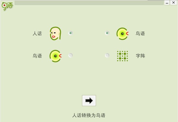 鸟语2003有3种转换功能:1.人话转为鸟语。2.鸟语转为人话。3.人话转为字阵。