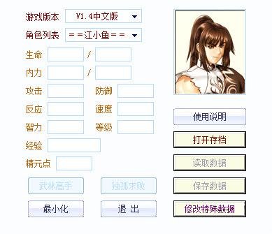 修改几乎所有人物的生命,内力,攻击,防御,反应,速度,智力,等级,经验,精元点 可以打开存档,修改特殊数据等