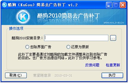 酷狗7最新版广告去除工具 绿色版 酷狗7最新版广告去除工具是针对最新版酷狗音乐制作的一键去广告软件。该软件会自动识别酷狗安装目录,如果自动识别酷狗安装目录不正确,请手动指定安装目录!