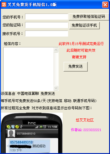 悠叉叉社区制作的最新免费发手机短信软件,每个手机号每天可免费发送50条短信,所有过程完全免费,赶紧下载体验吧。 使用方法: 1、填写手机号,得到验证码 2、输入验证码,输入要收的电话号码 3、输入要发的内容,点击免费发送