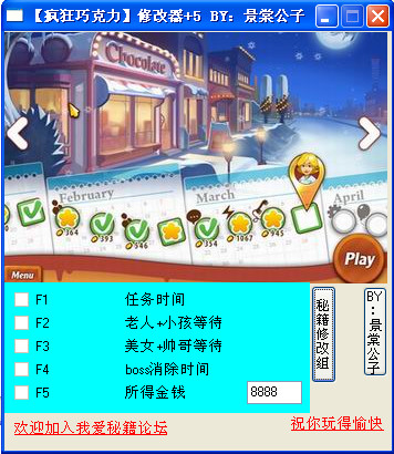 疯狂巧克力是以经营一家巧克力店为主题的游戏,本补丁由MJ修改组提供,可以修改任务时间、客人等待时间延长、金钱无限等五项功能