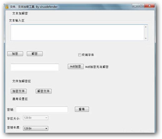 文件文本加密工具 1.0 绿色免费版 文件文本加密工具是一款防范暴力破解的文件加密软件,它采用了AES加密算法,这和winrar采用的加密算法是一样的,用户可以自己选择密钥的长度。该加密软件支持文本和文件加密,也可以将文本进行Md5加密(辅助功能),这样你就能更加放心地将资料加密处理了。