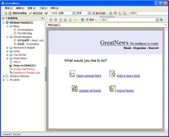 GreatNews,一款好用的RSS新闻阅读器,速度超快,特别针对大量频道同步更新而设计。GreatNews是一个市场占有率最大的rss客户端阅读器.